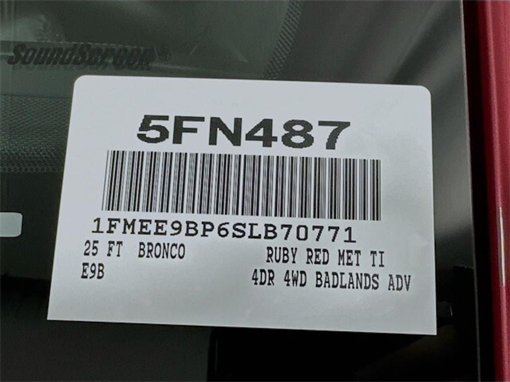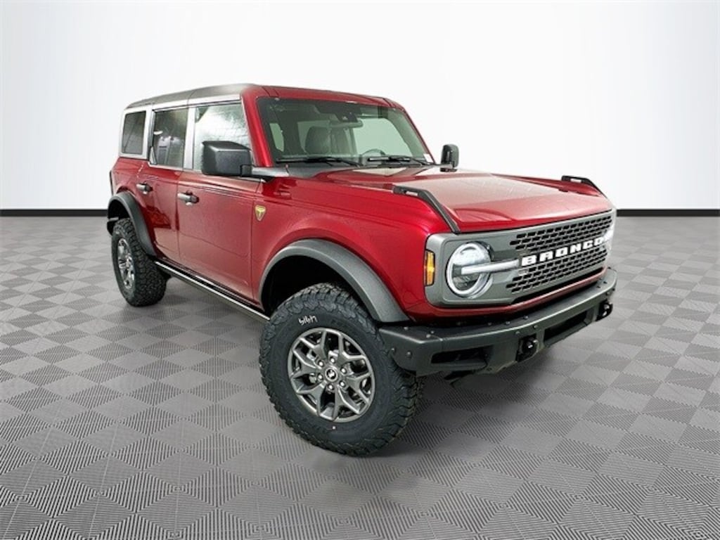 Ruby Red 2025 Ford Bronco Badlands 4WD 2.7L EcoBoost V6 4D Sport Utility 10-Speed Automatic 2-Door Intelligent Access w/Lock/Unlock, 4-Wheel Disc Brakes, 4.7 Axle Ratio, 7 Speakers, ABS brakes, Air Conditioning, Alloy wheels, AM/FM radio: SiriusXM with 360L, AM/FM Stereo, Ambient Footwell Lighting, Auto High-Beam Headlamps, Auto High-beam Headlights, Auto-dimming Rear-View mirror, BLIS Blind Spot Information System, Brake assist, Carbonized Gray Molded-In-Color Hard Top, Compass, Connected Navigation, Delay-off headlights, Door Storage Bags, Dr & Pass Illuminated Sliding Visor Vanity Mirrors, Driver door bin, Driver vanity mirror, Dual front impact airbags, Dual front side impact airbags, Dual Smart Charging USB Ports, Dual-Zone Electronic Automatic Temperature Control, Electronic Stability Control, Emergency communication system: 911 Assist, Equipment Group 332A Mid Package, Exterior Parking Camera Rear, Ford Performance Heavy-Duty Modular Front Bumper, Front anti-roll bar, Front Bucket Seats, Front Center Armrest, Front fog lights, Front reading lights, Front Row Heated Seats, Front wheel independent suspension, Fully automatic headlights, Heated door mirrors, Heated front seats, Heated steering wheel, Illuminated entry, Integrated roll-over protection, Lane-Keeping System, Leather Shift Knob, Leather-Trimmed/Vinyl Bucket Seats, Low tire pressure warning, Marine Grade Vinyl Heated Bucket Seats, Occupant sensing airbag, Outside temperature display, Overhead airbag, Overhead console, Panic alarm, Passenger door bin, Passenger vanity mirror, Power door mirrors, Power Outlet - Back Side of Center Floor Console, Power steering, Power windows, Pre-Collision Assist w/Automatic Emergency Braking, Radio data system, Rear Parking Sensors, Rear-View Camera, Rear-Window Defroster & Washer, Remote keyless entry, Security system, SiriusXM w/360L, Speed control, Split folding rear seat, Steering wheel mounted audio controls, SYNC 4, Tachometer, Telescoping steering wheel, Tilt steering wheel, Traction control, Trip computer, Upgraded Carpet Floor Mats, Variably intermittent wipers, Voltmeter, Wheels: 17" Carbonized Gray-Painted Aluminum.