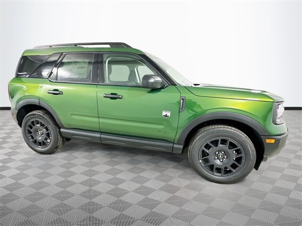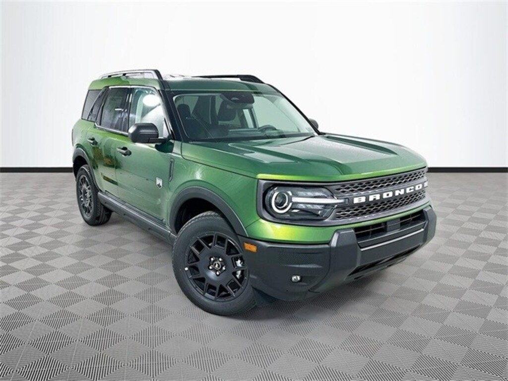 Eruption Green Metallic 2025 Ford Bronco Sport Big Bend 4WD 1.5L EcoBoost 4D Sport Utility 8-Speed Automatic Convenience Package, Equipment Group 200A, Front Driver/Passenger Seat Back Map Pockets, Heated 8-Way Power Driver's Seat, LED Fog Lamps, Premium Wrapped Steering Wheel, Universal Garage Door Opener (UGDO), 4-Wheel Disc Brakes, 6 Speakers, ABS brakes, Air Conditioning, Alloy wheels, AM/FM radio: SiriusXM, AM/FM Stereo, Auto High-beam Headlights, Automatic temperature control, Brake assist, Cargo Mat, Cloth w/Easy-to-Clean Front Bucket Seats, Compass, Delay-off headlights, Driver door bin, Driver vanity mirror, Dual front impact airbags, Dual front side impact airbags, Electronic Stability Control, Emergency communication system: SYNC 4 911 Assist, Four wheel independent suspension, Front & Rear Floor Liners w/o Carpet Mats, Front anti-roll bar, Front Bucket Seats, Front Center Armrest, Front reading lights, Fully automatic headlights, Heated door mirrors, Illuminated entry, Keyless Entry Keypad (DIO), Knee airbag, Low tire pressure warning, Occupant sensing airbag, Outside temperature display, Overhead airbag, Overhead console, Panic alarm, Passenger door bin, Passenger vanity mirror, Power door mirrors, Power steering, Power windows, Radio data system, Rear anti-roll bar, Rear Parking Sensors, Rear reading lights, Rear seat center armrest, Rear window defroster, Rear window wiper, Remote keyless entry, Security system, SiriusXM, Speed control, Speed-sensing steering, Speed-Sensitive Wipers, Split folding rear seat, Steering wheel mounted audio controls, SYNC 4 w/Enhanced Voice Recognition, Tachometer, Telescoping steering wheel, Tilt steering wheel, Traction control, Trip computer, Variably intermittent wipers, Wheels: 17" Carbonized Gray-Painted Aluminum, Wheels: 18" Dark Gravity Gray-Painted Aluminum, Convenience Package, Equipment Group 200A, Front Driver/Passenger Seat Back Map Pockets, Heated 8-Way Power Driver's Seat, LED Fog Lamps, Premium Wrapped Steering Wheel, Universal Garage Door Opener (UGDO).