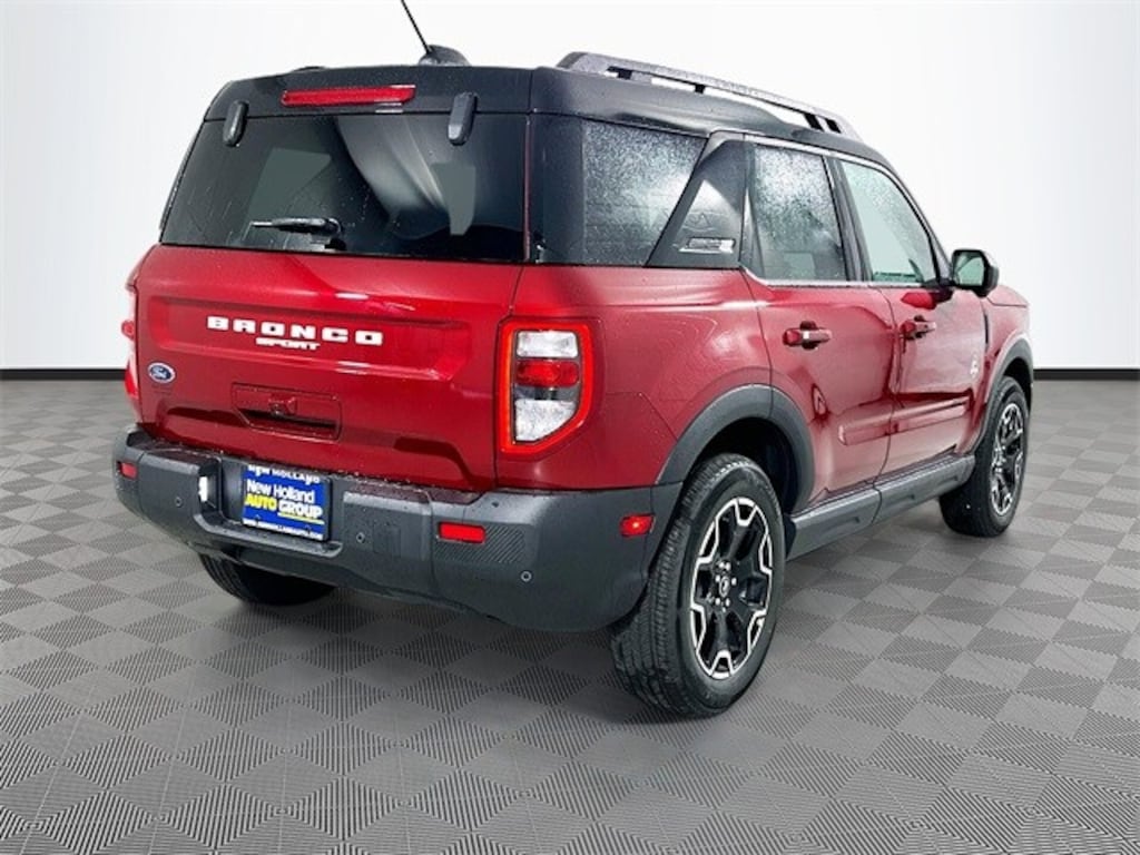 Ruby Red 2025 Ford Bronco Sport Outer Banks 4WD 1.5L EcoBoost 4D Sport Utility 8-Speed Automatic 360-Degree Camera w/Trail & Split View, 4-Wheel Disc Brakes, 6 Speakers, ABS brakes, Air Conditioning, Alloy wheels, AM/FM radio: SiriusXM, AM/FM Stereo, Auto High-beam Headlights, Auto-dimming Rear-View mirror, Automatic temperature control, B&O Sound System by Bang & Olufsen, Brake assist, Cargo Mat, Compass, Connected Navigation, Delay-off headlights, Driver door bin, Driver vanity mirror, Dual front impact airbags, Dual front side impact airbags, Electronic Stability Control, Emergency communication system: SYNC 4 911 Assist, Equipment Group 300A, Four wheel independent suspension, Front & Rear Floor Liners w/o Carpet Mats, Front anti-roll bar, Front Bucket Seats, Front Center Armrest, Front Driver/Passenger Seat Back Map Pockets, Front dual zone A/C, Front fog lights, Front License Plate Bracket, Front Parking Sensors, Front reading lights, Fully automatic headlights, Garage door transmitter, HD Radio, Heated door mirrors, Heated front seats, Heated steering wheel, Illuminated entry, Keyless Entry Keypad (DIO), Knee airbag, Low tire pressure warning, Memory seat, Occupant sensing airbag, Outer Banks Tech Package+, Outside temperature display, Overhead airbag, Overhead console, Panic alarm, Passenger door bin, Passenger vanity mirror, Power door mirrors, Power driver seat, Power Moonroof, Power passenger seat, Power steering, Power windows, Premium Trimmed Front Bucket Seats w/Ebony/Roast, Radio data system, Rain sensing wipers, Rear anti-roll bar, Rear Parking Sensors, Rear reading lights, Rear seat center armrest, Rear window defroster, Rear window wiper, Remote keyless entry, Reverse Brake Assist, Security system, SiriusXM, Speed control, Speed-sensing steering, Speed-Sensitive Wipers, Split folding rear seat, Steering wheel mounted audio controls, SYNC 4 w/Enhanced Voice Recognition, Tachometer, Telescoping steering wheel, Tilt steering wheel, Traction control, Trip computer, Variably intermittent wipers, Wheels: 18" Ebony Black-Painted Aluminum.