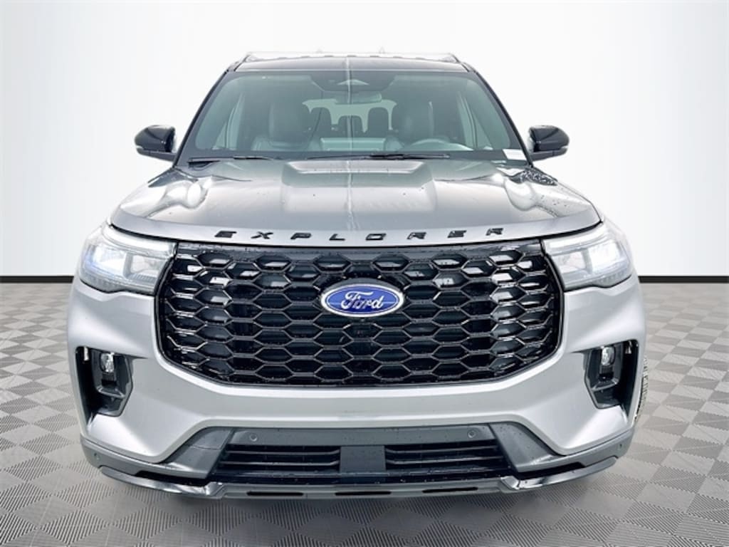 Gray 2025 Ford Explorer ST-Line 4WD 2.3L EcoBoost I-4 4D Sport Utility 10-Speed Automatic 4WD, 10 Speakers, 3.58 Non-Limited Slip Rear Axle, 3rd row seats: bench, 4-Wheel Disc Brakes, ABS brakes, Air Conditioning, Alloy wheels, AM/FM radio: SiriusXM with 360L, Apple CarPlay/Android Auto, Auto High-beam Headlights, Automatic temperature control, Brake assist, Bumpers: body-color, Compass, Delay-off headlights, Driver door bin, Driver vanity mirror, Dual front impact airbags, Dual front side impact airbags, Electronic Stability Control, Emergency communication system: 911 Assist, Equipment Group 300A Standard Package, Exterior Parking Camera Rear, Four wheel independent suspension, Front anti-roll bar, Front Bucket Seats, Front Center Armrest, Front dual zone A/C, Front fog lights, Front reading lights, Fully automatic headlights, Garage door transmitter, Heated door mirrors, Heated front seats, Heated steering wheel, Heated Unique Cloth Captain's Chairs, Illuminated entry, Knee airbag, Leather steering wheel, Low tire pressure warning, Navigation System, Occupant sensing airbag, Outside temperature display, Overhead airbag, Overhead console, Panic alarm, Passenger door bin, Passenger vanity mirror, Performance Brakes, Power door mirrors, Power driver seat, Power Liftgate, Power passenger seat, Power steering, Power windows, Radio: B&O Sound System by Bang & Olufsen, Rear air conditioning, Rear anti-roll bar, Rear reading lights, Rear window defroster, Rear window wiper, Red Painted Perf Front & Rear Brake Calipers, Remote keyless entry, Security system, Speed control, Speed-sensing steering, Speed-Sensitive Wipers, Split folding rear seat, Spoiler, ST-Line Street Pack, Steering wheel mounted audio controls, Tachometer, Telescoping steering wheel, Tilt steering wheel, Traction control, Trip computer, Variably intermittent wipers, Wheels: 20" Ebony-Painted Machined Aluminum, Wheels: 21" Magnetite-Painted Aluminum, 4WD.