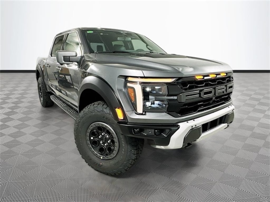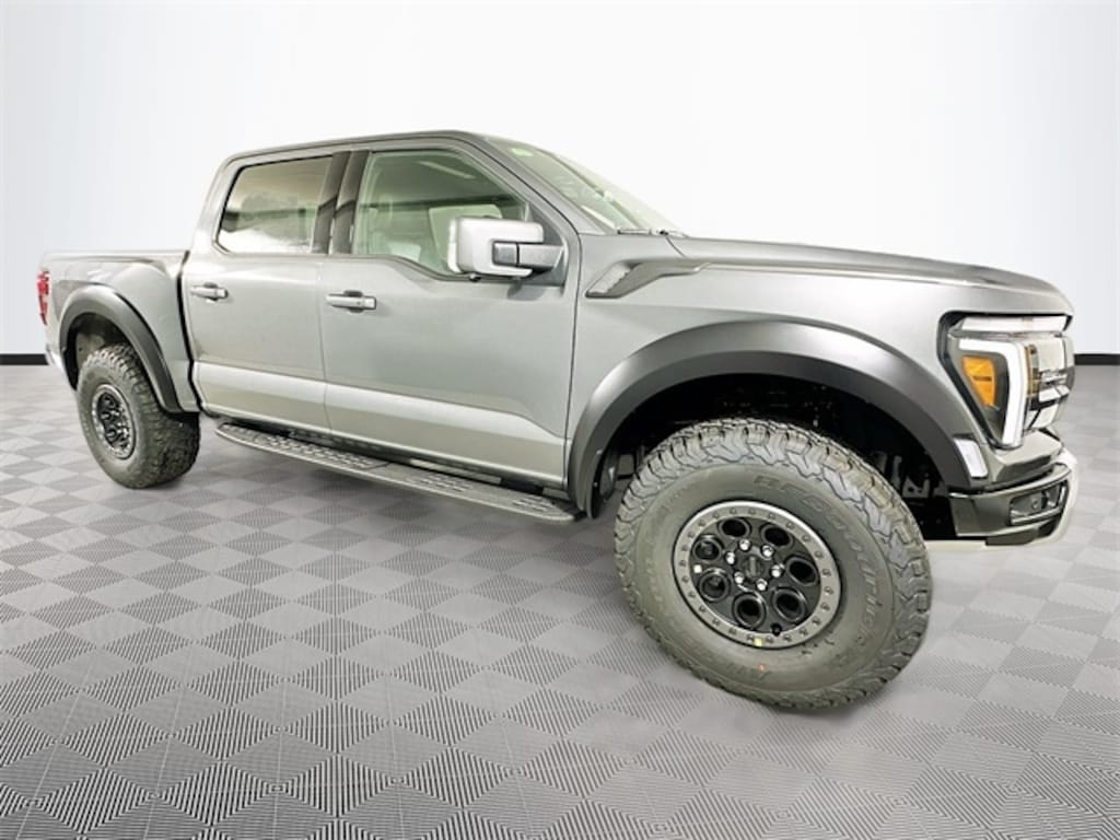 Gray 2025 Ford F-150 Raptor 4WD 3.5L V6 EcoBoost 4D SuperCrew 10-Speed Automatic 4WD, 14 Speakers, 17" Cast Aluminum Wheels, 4-Wheel Disc Brakes, ABS brakes, Adjustable pedals, Air Conditioning, Alloy wheels, AM/FM radio: SiriusXM with 360L, Auto High-beam Headlights, Auto tilt-away steering wheel, Auto-dimming door mirrors, Auto-dimming Rear-View mirror, Automatic temperature control, Brake assist, Bumpers: body-color, Carbon Fiber Interior Appliques, Compass, Delay-off headlights, Driver door bin, Driver vanity mirror, Dual front impact airbags, Dual front side impact airbags, Dual Valve Shocks, Electronic Locking w/4.10 Axle Ratio, Electronic Stability Control, Emergency communication system: SYNC 4 911 Assist, Equipment Group 802A Raptor 37, First Aid Kit w/Ford Logo, Front anti-roll bar, Front Bucket Seats, Front Center Armrest, Front dual zone A/C, Front fog lights, Front reading lights, Front wheel independent suspension, Fully automatic headlights, Garage door transmitter, Heads-Up Display, Heated door mirrors, Heated front seats, Heated rear seats, Heated steering wheel, Illuminated entry, Lane Departure Warning System, Leather steering wheel, Leather Trimmed Seats, Low tire pressure warning, Memory seat, Modular Front Bumper, Navigation system: Connected Navigation, Occupant sensing airbag, Outside temperature display, Overhead airbag, Overhead console, Panic alarm, Passenger door bin, Passenger vanity mirror, Pedal memory, Power door mirrors, Power driver seat, Power passenger seat, Power steering, Power windows, Radio data system, Radio: B&O Unleashed Sound System by Bang & Olufsen, Rain sensing wipers, Rear reading lights, Rear step bumper, Rear window defroster, RECARO Alcantara Suede Front Seats, Remote keyless entry, SecuriCode Keyless-Entry Keypad, Security system, Speed control, Speed-sensing steering, Split folding rear seat, Steering wheel memory, Steering wheel mounted audio controls, SYNC 4 w/Enhanced Voice Recognition, Tachometer, Telescoping steering wheel, Tilt steering wheel, Traction control, Trip computer, Turn signal indicator mirrors, Twin Panel Moonroof, Variably intermittent wipers, Ventilated front seats, Wheels: Raptor 37 Unique 17" Cast Aluminum, 4WD.