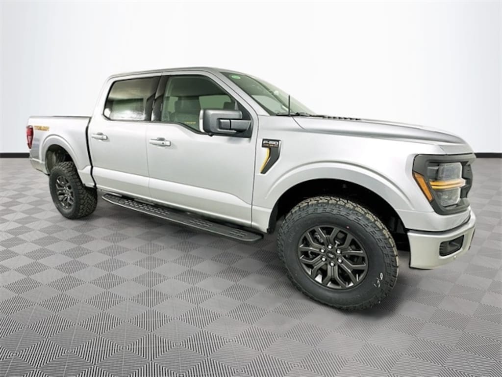Silver Metallic 2025 Ford F-150 Tremor 4WD 3.5L V6 EcoBoost 4D SuperCrew 10-Speed Automatic 4WD, 4 Pickup Box Tie-Down Plates, 4-Wheel Disc Brakes, 8 Speakers, ABS brakes, Adjustable pedals, Air Conditioning, Alloy wheels, AM/FM radio: SiriusXM with 360L, Auto High-beam Headlights, Auto-dimming door mirrors, Auto-dimming Rear-View mirror, Automatic temperature control, Bed Utility Package, Black Tailgate Decal, Brake assist, Bumpers: body-color, Compass, Delay-off headlights, Driver door bin, Driver vanity mirror, Dual front impact airbags, Dual front side impact airbags, Electronic Locking w/3.73 Axle Ratio, Electronic Stability Control, Emergency communication system: SYNC 4 911 Assist, Equipment Group 401A Standard, Front anti-roll bar, Front Bucket Seats, Front Center Armrest, Front dual zone A/C, Front fog lights, Front License Plate Bracket, Front reading lights, Front wheel independent suspension, Fully automatic headlights, GVWR: 7,100 lbs Payload Package, Heated door mirrors, Heated front seats, Illuminated entry, Integrated Trailer Brake Controller, Internet access capable: FordPass Connect 5G, LED Box Lighting, Low tire pressure warning, Navigation system: Connected Navigation, Occupant sensing airbag, Outside temperature display, Overhead airbag, Overhead console, Panic alarm, Passenger door bin, Passenger vanity mirror, Power door mirrors, Power driver seat, Power passenger seat, Power steering, Power Tailgate, Power windows, Radio data system, Radio: B&O Sound System by Bang & Olufsen, Rear reading lights, Rear step bumper, Rear window defroster, Remote keyless entry, Retractable Rear Center Step, SecuriCode Keyless-Entry Keypad, Security system, Speed control, Split folding rear seat, Steering wheel mounted audio controls, SYNC 4 w/Enhanced Voice Recognition, Tachometer, Tailgate Step w/Tailgate Work Surface, Telescoping steering wheel, Tilt steering wheel, Tow/Haul Package, Traction control, Tray Style Floor Liner w/Carpet Mats, Trip computer, Turn signal indicator mirrors, Unique Sport Cloth 40/Console/40 Power Front Seat, Variably intermittent wipers, Voltmeter, Wheels: 18" Alloy w/Dark Matte Finish, 4WD.