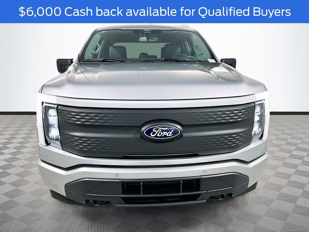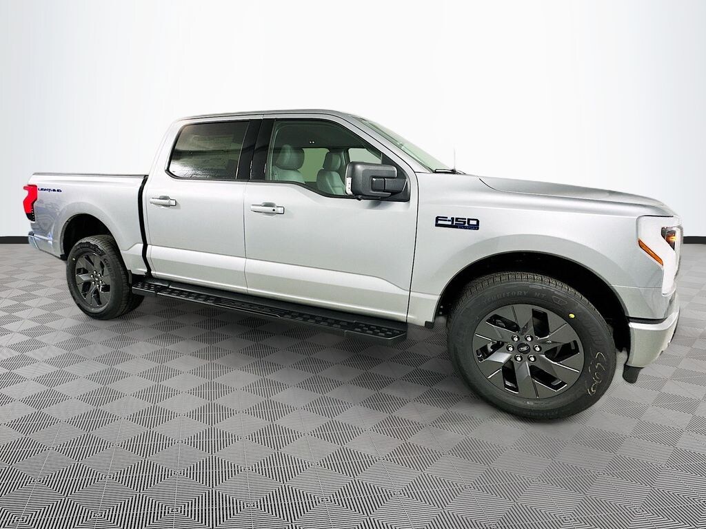 Silver Metallic 2025 Ford F-150 Lightning Flash AWD Electric Motor 4D Crew Cab Single-Speed Automatic 4-Wheel Disc Brakes, 8 Speakers, ABS brakes, ActiveX Trimmed Heated Front Seats, Adjustable pedals, Air Conditioning, Alloy wheels, Auto High-beam Headlights, Auto-dimming Rear-View mirror, Automatic temperature control, Brake assist, Bumpers: body-color, Compass, Delay-off headlights, Driver door bin, Driver vanity mirror, Dual front impact airbags, Dual front side impact airbags, E-Locker, Electronic Stability Control, Emergency communication system: SYNC 4 911 Assist, Equipment Group 312A Standard, Four wheel independent suspension, Front anti-roll bar, Front Bucket Seats, Front Center Armrest, Front dual zone A/C, Front License Plate Bracket, Front reading lights, Fully automatic headlights, Heated door mirrors, Heated front seats, Heated steering wheel, Hill Decent Control, Illuminated entry, Internet access capable: FordPass Connect 4G, Knee airbag, Low tire pressure warning, Max Trailer Tow Package, Mobile Power Cord (120/240V), Navigation system: Connected Navigation, Occupant sensing airbag, Outside temperature display, Overhead airbag, Overhead console, Panic alarm, Passenger door bin, Passenger vanity mirror, Power door mirrors, Power driver seat, Power passenger seat, Power steering, Power windows, Radio data system, Radio: B&O Sound System by Bang & Olufsen, Rear anti-roll bar, Rear reading lights, Rear step bumper, Rear window defroster, Remote keyless entry, Security system, Speed control, Speed-sensing steering, Split folding rear seat, Steering wheel mounted audio controls, SYNC 4A w/Enhanced Voice Recognition, Tailgate Step w/Tailgate Work Surface, Telescoping steering wheel, Tilt steering wheel, Traction control, Trailer Brake Controller, Tray Style Floor Liner w/o Carpet Mats, Trip computer, Turn signal indicator mirrors, Variably intermittent wipers, Wheels: 20" Alloy Dark Carbonized Gray.