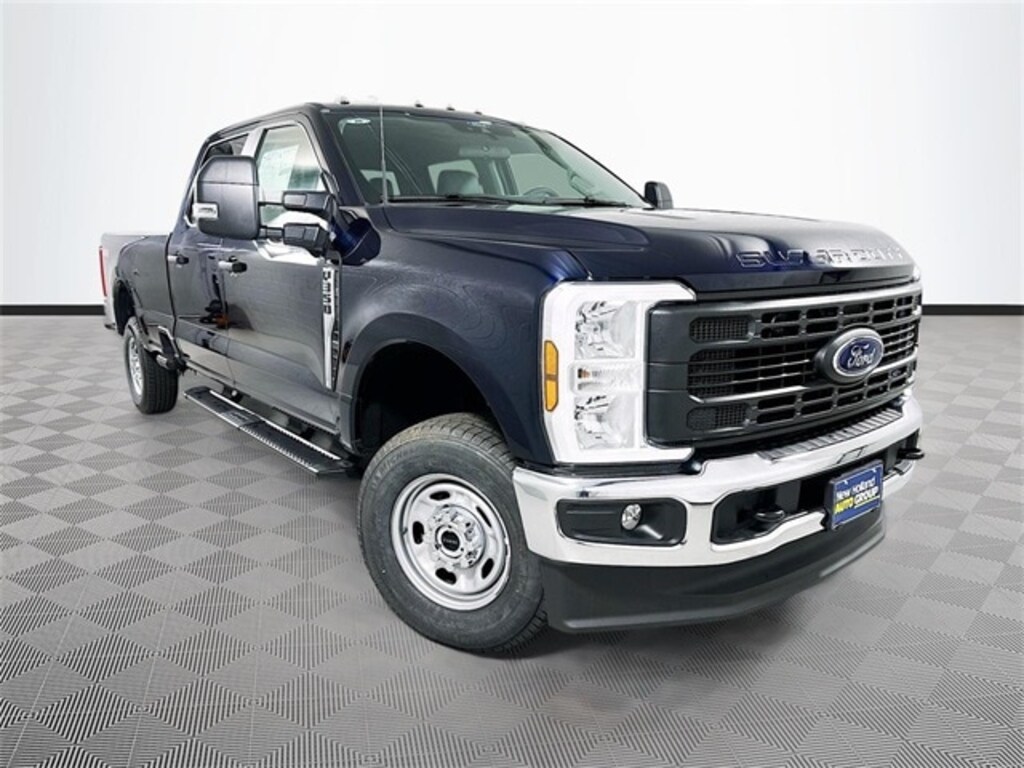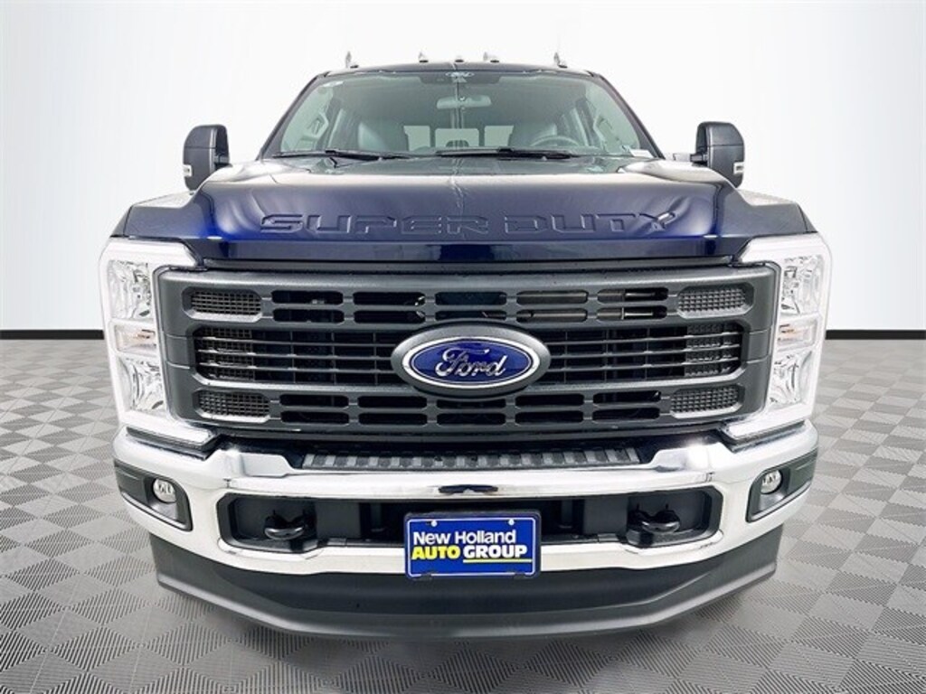Blue Metallic 2025 Ford F-350SD XL 4WD 6.8L V8 4D Crew Cab 10-Speed Automatic 4WD, 17" Argent Painted Steel Wheels, 250 Amp Alternator (Gas), 4-Wheel Disc Brakes, 6 Speakers, ABS brakes, Air Conditioning, AM/FM radio, AM/FM Stereo w/MP3 Player, Brake assist, Bright Chrome Hub Covers & Center Ornaments, Chrome Front Bumper, Chrome Rear Step Bumper, Compass, Delay-off headlights, Dual front impact airbags, Dual front side impact airbags, Electronic Stability Control, Emergency communication system: SYNC 4 911 Assist, Exterior Parking Camera Rear, Front anti-roll bar, Front Center Armrest w/Storage, Front License Plate Bracket, Front reading lights, Fully automatic headlights, Halogen Fog Lamps, HD Vinyl 40/20/40 Split Bench Seat, Heated door mirrors, Illuminated entry, LED Roof Clearance Lights, Low tire pressure warning, Order Code 610A, Outside temperature display, Overhead airbag, Overhead console, Panic alarm, Passenger vanity mirror, Platform Running Boards, Power door mirrors, Power steering, Power windows, Power-Sliding Rear-Window w/Defrost, Privacy Glass, Rear reading lights, Rear step bumper, Remote keyless entry, Security system, Snow Plow Prep Package, Speed control, Split folding rear seat, Steering wheel mounted audio controls, SYNC 4, Tachometer, Telescoping steering wheel, Tilt steering wheel, Traction control, Trailer Brake Controller, Trip computer, Turn signal indicator mirrors, Upfitter Switches (6), Variably intermittent wipers, XL Chrome Package, 4WD.