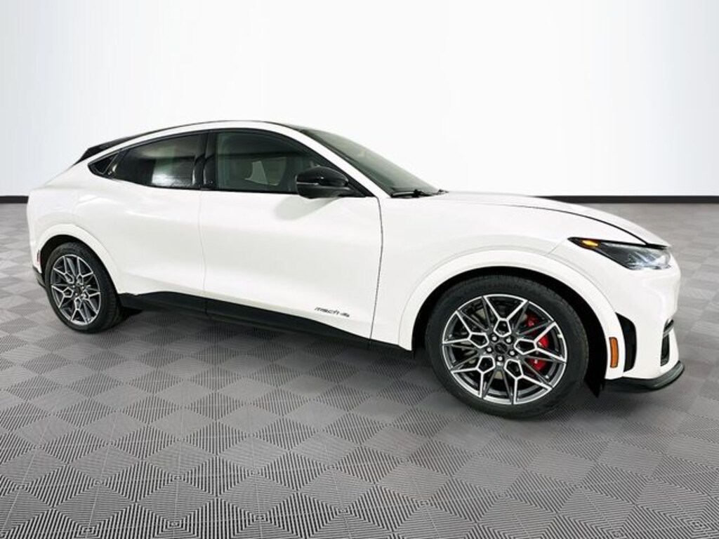 White Metallic 2025 Ford Mustang Mach-E GT AWD Electric Motor 4D Sport Utility Single-Speed Automatic 10 Speakers, 1st & 2nd Row Floor Liners w/o Carpet Mats, 4-Wheel Disc Brakes, ABS brakes, Adaptive suspension, Air Conditioning, Alloy wheels, AM/FM radio: SiriusXM with 360L, Apple CarPlay/Android Auto, Auto High-beam Headlights, Auto-dimming Rear-View mirror, Automatic temperature control, Brake assist, Bumpers: body-color, Cargo Area Cover, Cargo Floor Liner, Compass, Delay-off headlights, Driver door bin, Driver vanity mirror, Dual front impact airbags, Dual front side impact airbags, Electronic Stability Control, Emergency communication system: 911 Assist, Equipment Group 400A Standard Package, Exterior Parking Camera Rear, Four wheel independent suspension, Front anti-roll bar, Front Bucket Seats, Front Center Armrest, Front dual zone A/C, Front reading lights, Fully automatic headlights, Garage door transmitter, Heated door mirrors, Heated front seats, Heated Perforated ActiveX Performance Seats, Heated steering wheel, Hood & Decklid Stripe/Door Graphics Delete, Illuminated entry, Interior Protection Package, Internet access capable: FordPass Connect, Knee airbag, Low tire pressure warning, Memory seat, Mobile Power Cord (120V/240V), Navigation system: Connected Navigation, Occupant sensing airbag, Outside temperature display, Overhead airbag, Overhead console, Panic alarm, Panoramic Fixed-Glass Roof, Passenger door bin, Passenger vanity mirror, Power door mirrors, Power driver seat, Power Liftgate, Power passenger seat, Power steering, Power windows, Radio data system, Radio: B&O Sound System by Bang & Olufsen, Rain sensing wipers, Rear anti-roll bar, Rear seat center armrest, Rear side impact airbag, Rear window defroster, Rear window wiper, Remote keyless entry, Security system, SiriusXM w/360L, Speed control, Speed-sensing steering, Speed-Sensitive Wipers, Split folding rear seat, Spoiler, Steering wheel mounted audio controls, SYNC 4A w/Enhanced Voice Recognition, Telescoping steering wheel, Tilt steering wheel, Tire Inflator & Sealant Kit, Traction control, Trip computer, Turn signal indicator mirrors, Variably intermittent wipers, Wheels: 20" Machined Face Aluminum, Wheels: 20" Monochromatic High Gloss Black-Painted.