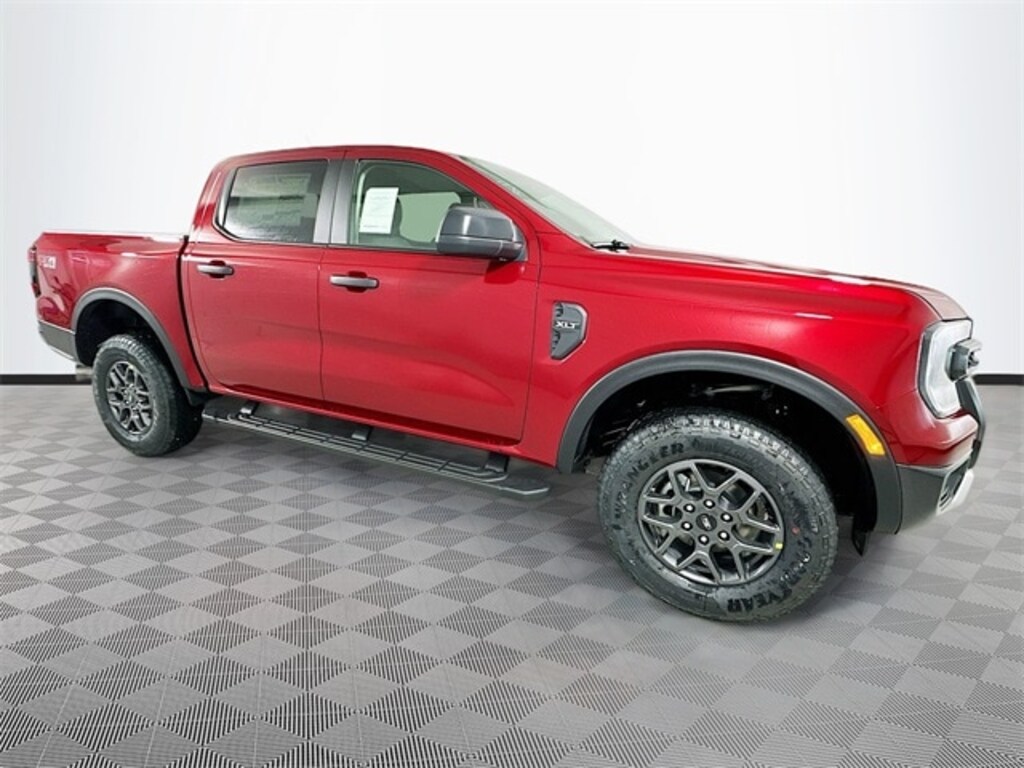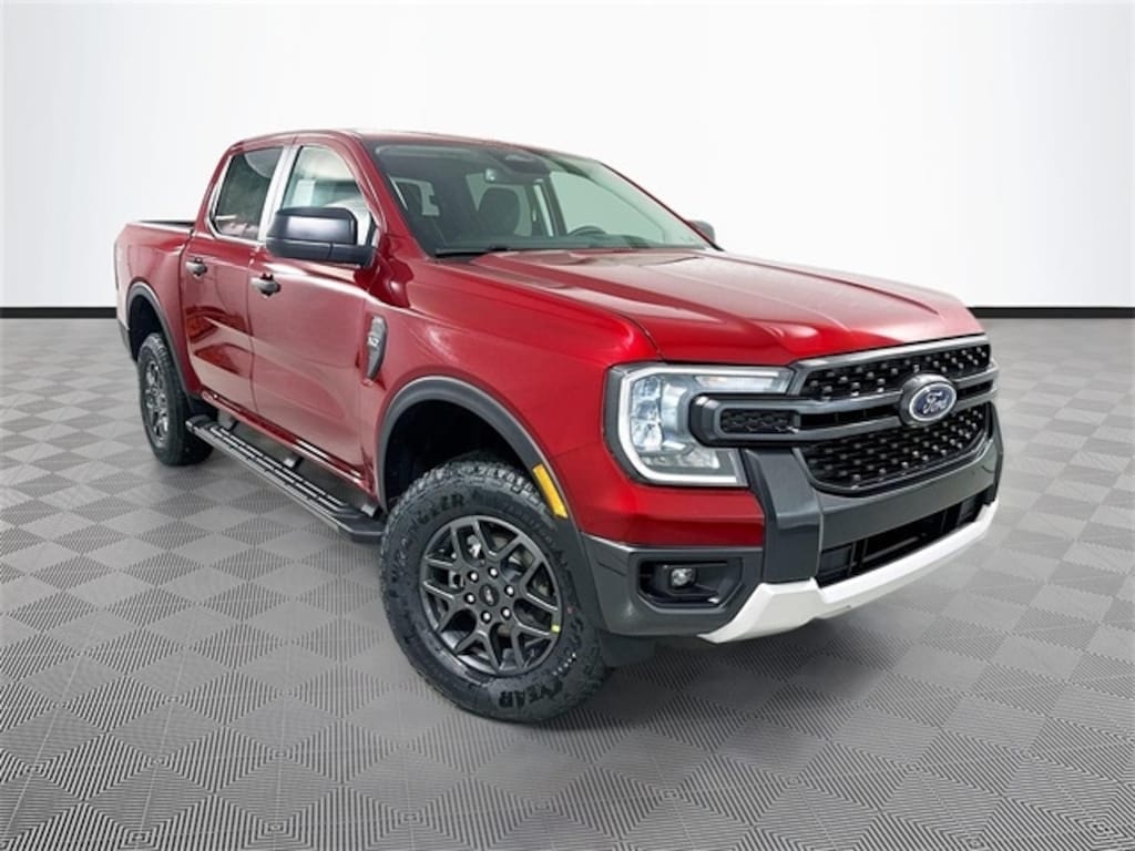 Ruby Red 2025 Ford Ranger XLT 4WD EcoBoost 2.3L I4 GTDi DOHC Turbocharged VCT 4D Crew Cab 10-Speed Automatic 4WD, 12" Display in Center Stack, 120V/400W In-Cab & In-Bed Power Outlets, 4-Wheel Disc Brakes, 6 Speakers, ABS brakes, Advanced Towing Package, Air Conditioning, Alloy wheels, AM/FM radio: SiriusXM, AM/FM Stereo, Auto High-beam Headlights, Auto-dimming Rear-View mirror, Black Running Boards, Brake assist, Class IV Trailer Hitch Receiver, Cloth Front Bucket Seats, Compass, Convenience Package, Delay-off headlights, Driver door bin, Driver vanity mirror, Dual front impact airbags, Dual front side impact airbags, Dual-Zone Electronic Climate Control (DEATC), Electronic Stability Control, Emergency communication system: SYNC 4 911 Assist, Equipment Group 301A High, Front anti-roll bar, Front Bucket Seats, Front Center Armrest, Front fog lights, Front License Plate Bracket, Front reading lights, Front wheel independent suspension, Fully automatic headlights, FX4 Off-Road Box Decal, FX4 Off-Road Package, FX4 Selectable Drive Modes, Gray Painted Center Bar & Grille Surround, Gray Painted Front Fascia & Rear Bumper, Illuminated entry, Leather Shift Knob, Low tire pressure warning, Navigation system: Connected Navigation, Occupant sensing airbag, Off-Road Screen in Center Stack, Off-Road Tuned Shocks, Outside temperature display, Overhead airbag, Overhead console, Panic alarm, Passenger door bin, Passenger vanity mirror, Power door mirrors, Power steering, Power windows, Power-Sliding Rear Window, Pro Trailer Backup Assist, Rear reading lights, Rear seat center armrest, Rear step bumper, Rear window defroster, Remote keyless entry, Security system, SiriusXM Satellite Radio, Speed control, Speed-sensing steering, Sport Appearance Package, Sport Box Decal, Steering wheel mounted audio controls, SYNC 4A w/Connected Navigation, Telescoping steering wheel, Tilt steering wheel, Traction control, Trail Control, Trailer Brake Controller, Trailer Tow Package, Tray Style Floor Liner, Trip computer, Variably intermittent wipers, Voltmeter, Wheels: 17" Gray-Painted Aluminum, Wireless Charging Pad, 4WD.