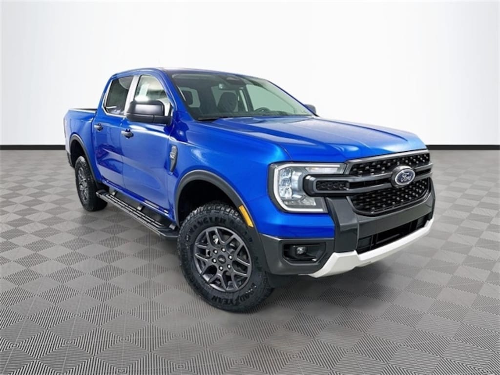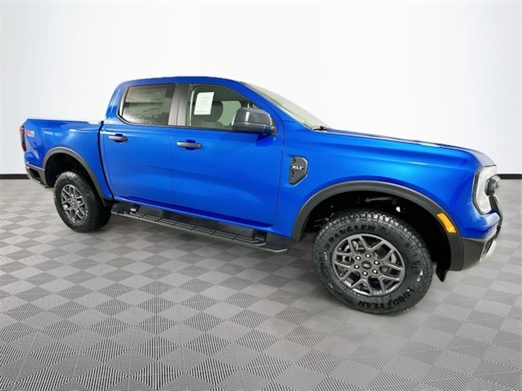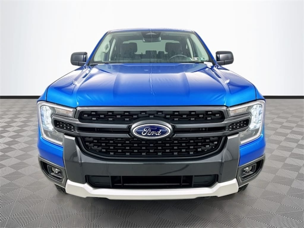 Blue 2025 Ford Ranger XLT 4WD EcoBoost 2.3L I4 GTDi DOHC Turbocharged VCT 4D Crew Cab 10-Speed Automatic 4WD, 120V/400W In-Cab & In-Bed Power Outlets, 4-Wheel Disc Brakes, 6 Speakers, ABS brakes, Advanced Towing Package, Air Conditioning, Alloy wheels, AM/FM radio: SiriusXM, AM/FM Stereo, Auto High-beam Headlights, Auto-dimming Rear-View mirror, Black Running Boards, Blk SecuriCode Wireless Keyless Entry Keypad (DIO), Brake assist, Class IV Trailer Hitch Receiver, Cloth Front Bucket Seats, Compass, Convenience Package, Delay-off headlights, Driver door bin, Driver vanity mirror, Dual front impact airbags, Dual front side impact airbags, Electronic Stability Control, Emergency communication system: SYNC 4 911 Assist, Equipment Group 300A Standard, Front anti-roll bar, Front Bucket Seats, Front Center Armrest, Front fog lights, Front License Plate Bracket, Front reading lights, Front wheel independent suspension, Fully automatic headlights, FX4 Off-Road Box Decal, FX4 Off-Road Package, FX4 Selectable Drive Modes, Gray Painted Center Bar & Grille Surround, Gray Painted Front Fascia & Rear Bumper, Illuminated entry, Integrated Box Side Step, Leather Shift Knob, Low tire pressure warning, Navigation system: Connected Navigation, Occupant sensing airbag, Off-Road Screen in Center Stack, Off-Road Tuned Shocks, Outside temperature display, Overhead airbag, Overhead console, Panic alarm, Passenger door bin, Passenger vanity mirror, Pickup Box Extender, Power door mirrors, Power steering, Power windows, Pro Trailer Backup Assist, Rear reading lights, Rear seat center armrest, Rear step bumper, Rear window defroster, Remote keyless entry, Security system, SiriusXM Satellite Radio, Speed control, Speed-sensing steering, Sport Appearance Package, Sport Box Decal, Steering wheel mounted audio controls, SYNC 4A w/Connected Navigation, Telescoping steering wheel, Tilt steering wheel, Traction control, Trail Control, Trailer Brake Controller, Trailer Tow Package, Tray Style Floor Liner, Trip computer, Variably intermittent wipers, Voltmeter, Wheels: 17" Gray-Painted Aluminum, Wireless Charging Pad, 4WD.
