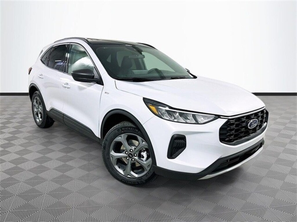 Silver Metallic 2026 Ford Escape ST-Line AWD 1.5L EcoBoost 4D Sport Utility Automatic AWD, 3.81 Axle Ratio, 4-Way Manual Front Passenger Seat, 4-Wheel Disc Brakes, 6 Speakers, 8-Way Power Driver Seat, ABS brakes, Adaptive Cruise Control with Stop-and-Go, Air Conditioning, Alloy wheels, AM/FM radio: SiriusXM 360L, Auto High-beam Headlights, Automatic temperature control, Black Roof-Rack Side Rails, Brake assist, Bumpers: body-color, Cold Weather Package, Compass, Connected Navigation (1-Year Included), Delay-off headlights, Digital Rear View Camera, Driver door bin, Driver vanity mirror, Dual front impact airbags, Dual front side impact airbags, Electronic Stability Control, Emergency communication system: SYNC 4 911 Assist, Equipment Group 300A, Evasive Steering Assist, Ford App, Ford Co-Pilot360 Assist+, Four wheel independent suspension, Front and Rear Floor Liners with Carpet Mats, Front anti-roll bar, Front Bucket Seats, Front Center Armrest, Front dual zone A/C, Front reading lights, Fully automatic headlights, Heated Front Row Seats, Heated Sideview Mirrors, Heated Steering Wheel, Heated steering wheel, Illuminated entry, Intersection Assist, Knee airbag, Low tire pressure warning, Occupant sensing airbag, Outside temperature display, Overhead airbag, Overhead console, Panic alarm, Panoramic Vista Roof, Partial Vinyl/Cloth Front Sport Contour Bucket Seats with Red Stitching, Passenger door bin, Passenger vanity mirror, Power door mirrors, Power driver seat, Power Liftgate, Power steering, Power windows, Predictive Speed Assist, Radio data system, Radio: AM/FM Stereo with SiriusXM 360L, Rear anti-roll bar, Rear Parking Sensor, Rear reading lights, Rear seat center armrest, Rear window defroster, Rear window wiper, Remote keyless entry, Remote Starter System, Speed control, Speed-sensing steering, Speed-Sensitive Wipers, Split folding rear seat, Spoiler, Sport steering wheel, Steering wheel mounted audio controls, SYNC 4, SYNC 4 with Enhanced Voice Recognition, Tachometer, Tech Pack #1, Telescoping steering wheel, Tilt steering wheel, Traction control, Trip computer, Variably intermittent wipers, Wheels: 18" Rock Metallic Painted Aluminum, AWD.