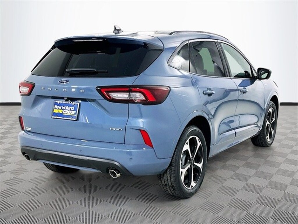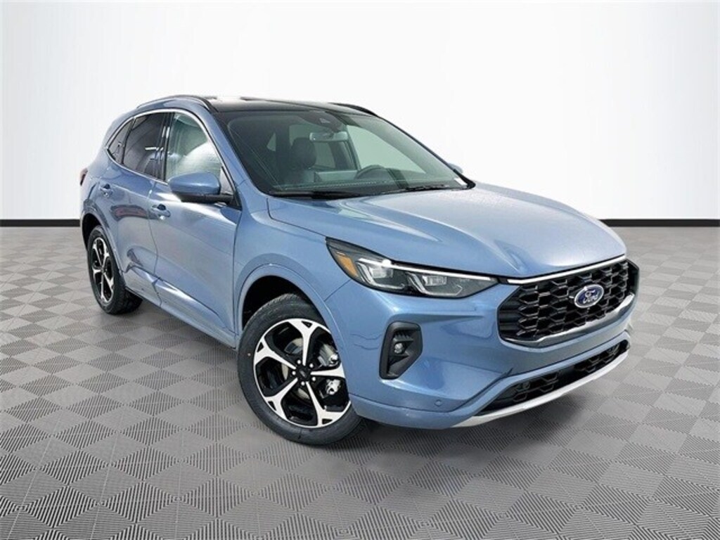 Blue 2026 Ford Escape ST-Line Elite AWD EcoBoost 2.0L I4 GTDi DOHC Turbocharged VCT 4D Sport Utility Automatic AWD, 10-Way Power Driver's Seat w/Memory, 360-Degree Camera with Split View, 4-Wheel Disc Brakes, 6 Speakers, 6-Way Power Front Passenger Seat, ABS brakes, ActiveX Trimmed Heated Front Sport Contour Bucket Seats with Quilting Design, Air Conditioning, Alloy wheels, AM/FM radio: SiriusXM 360L, Auto High-beam Headlights, Auto-dimming Rear-View mirror, Automatic temperature control, B&O Sound System by Bang & Olufsen, Black Roof-Rack Side Rails, Brake assist, Bumpers: body-color, Cargo Mat, Compass, Connected Navigation (1-Year Included), Delay-off headlights, Driver door bin, Driver vanity mirror, Dual front impact airbags, Dual front side impact airbags, Electronic Fuel Door Release, Electronic Stability Control, Emergency communication system: SYNC 4 911 Assist, Equipment Group 501A, Ford App, Four wheel independent suspension, Front and Rear Floor Liners with Carpet Mats, Front anti-roll bar, Front Bucket Seats, Front Center Armrest, Front dual zone A/C, Front fog lights, Front Parking Sensors, Front reading lights, Fully automatic headlights, HD Radio, Head-Up Display, Heated door mirrors, Heated front seats, Heated steering wheel, Illuminated entry, Knee airbag, Low tire pressure warning, Memory seat, Navigation system: Connected Navigation, Neutral Towing Capability, Occupant sensing airbag, Outside temperature display, Overhead airbag, Overhead console, Panic alarm, Panoramic Vista Roof, Partial Vinyl/Cloth Heated Front Sport Contour Bucket Seats with Red Stitching, Passenger door bin, Passenger vanity mirror, Pedestrian Alert Sounder, Power door mirrors, Power driver seat, Power Liftgate, Power passenger seat, Power steering, Power windows, Premium Technology Package, Radio data system, Radio: AM/FM Stereo with SiriusXM 360L, Rear anti-roll bar, Rear Parking Sensors, Rear reading lights, Rear seat center armrest, Rear window defroster, Rear window wiper, Remote keyless entry, Reverse Brake Assist, SecuriCode Illuminated Door Entry Keypad, Security system, Speed control, Speed-sensing steering, Speed-Sensitive Wipers, Split folding rear seat, Spoiler, Sport steering wheel, Steering wheel mounted audio controls, SYNC 4 with Enhanced Voice Recognition, Tachometer, Telescoping steering wheel, Tilt steering wheel, Traction control, Trip computer, Variably intermittent wipers, Wheels: 19" Machined-Face Ebony-Painted Aluminum, AWD.
