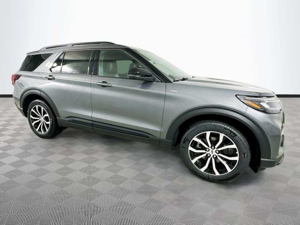 Gray 2026 Ford Explorer ST-Line 4WD 2.3L EcoBoost I-4 4D Sport Utility 10-Speed Automatic 4WD, 10 Speakers, 2nd Row Captain's Chairs w/E-Z Entry and Armrest, 3rd row seats: bench, 4-Wheel Disc Brakes, ABS brakes, Air Conditioning, Alloy wheels, AM/FM radio: SiriusXM with 360L, Apple CarPlay/Android Auto, Auto High-beam Headlights, Automatic temperature control, BlueCruise (equipment + 1-Time Purchase), BlueCruise Hardware, Brake assist, Bumpers: body-color, Compass, Delay-off headlights, Driver door bin, Driver vanity mirror, Dual front impact airbags, Dual front side impact airbags, Electronic Stability Control, Emergency communication system: 911 Assist, Equipment Group 300A Standard Package, Exterior Parking Camera Rear, Ford Connectivity Package (one-Time Purchase - 7 Years), Four wheel independent suspension, Front and 2nd Rows Floor Liners with Carper Floor Mats, Front anti-roll bar, Front Bucket Seats, Front Center Armrest, Front dual zone A/C, Front fog lights, Front License Plate Bracket, Front reading lights, Fully automatic headlights, Garage door transmitter, Heated door mirrors, Heated front seats, Heated steering wheel, Heated Unique Cloth Captain's Chairs, Illuminated entry, Knee airbag, Leather steering wheel, Low tire pressure warning, Navigation System, Occupant sensing airbag, Outside temperature display, Overhead airbag, Overhead console, Panic alarm, Panoramic Fixed Glass Roof with Power Shade, Passenger door bin, Passenger vanity mirror, Power door mirrors, Power driver seat, Power Liftgate, Power passenger seat, Power steering, Power windows, Radio: B&O Sound System by Bang and Olufsen, Rear air conditioning, Rear anti-roll bar, Rear reading lights, Rear window defroster, Rear window wiper, Remote keyless entry, SecuriCode Keyless Entry Keypad, Security system, Speed control, Speed-sensing steering, Speed-Sensitive Wipers, Split folding rear seat, Spoiler, Steering wheel mounted audio controls, Tachometer, Telescoping steering wheel, Tilt steering wheel, Traction control, Trip computer, Variably intermittent wipers, Wheels: 20" Ebony-Painted Machined Aluminum, 4WD.