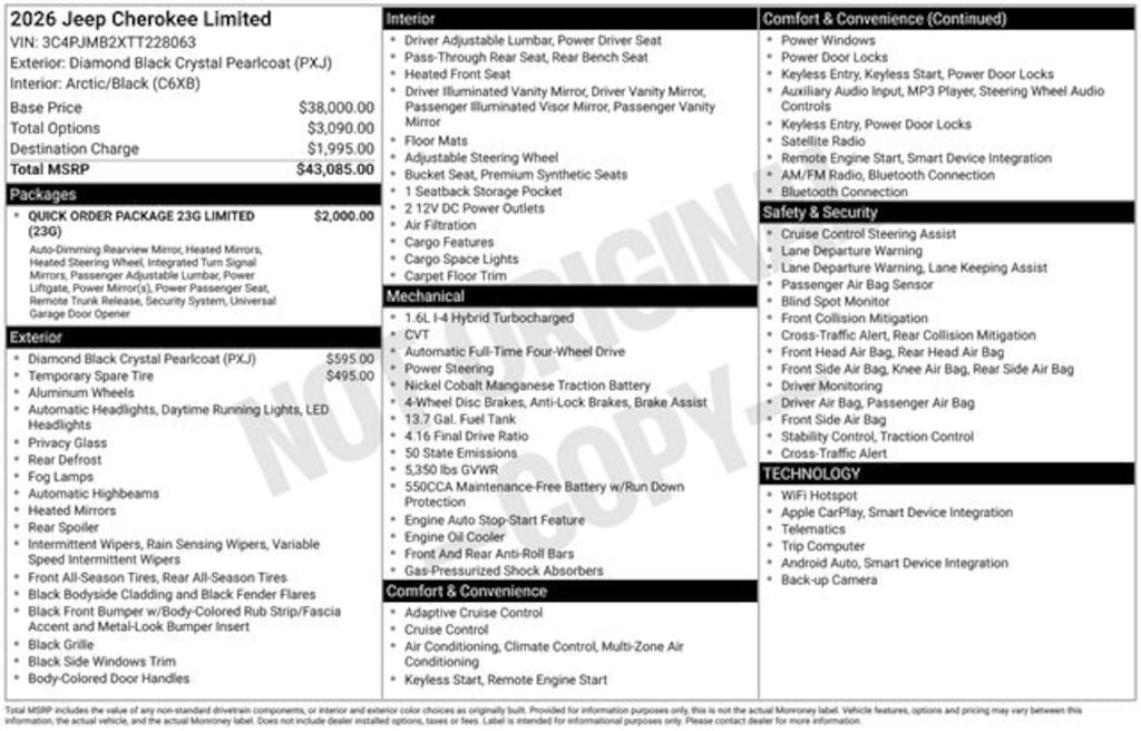 Diamond Black Crystal Pearlcoat 2026 Jeep Cherokee 4WD 1.6L I4 4D Sport Utility CVT 1.6L I4, 4-Wheel Disc Brakes, 4.16 Final Drive Ratio, 4G LTE Wi-Fi Hot Spot, 6 Speakers, ABS brakes, Air Conditioning, Alloy wheels, AM/FM radio: SiriusXM with 360L, Apple CarPlay, Apple CarPlay/Android Auto, Auto High-beam Headlights, Auto-Dimming Rear-View Mirror, Automatic temperature control, Brake assist, Capri Leatherette Perforated Seats, Cognac Interior Stitching, Compass, Delay-off headlights, Driver door bin, Driver vanity mirror, Dual front impact airbags, Dual front side impact airbags, Electronic Stability Control, Emergency communication system, Exterior Mirrors Courtesy Lamps, Exterior Mirrors with Supplemental Signals, Four wheel independent suspension, Front anti-roll bar, Front Bucket Seats, Front Center Armrest, Front dual zone A/C, Front fog lights, Front reading lights, Fully automatic headlights, Global Telematics Box Module (TBM), Gloss Black Mirrors, Google Android Auto, GPS Antenna Input, Heated door mirrors, Heated Exterior Mirrors, Heated front seats, Heated Steering Wheel, Illuminated entry, Knee airbag, Limited Badge, Low tire pressure warning, Occupant sensing airbag, Outside temperature display, Overhead airbag, Overhead console, Panic alarm, ParkView Rear Back-Up Camera, Passenger door bin, Passenger vanity mirror, Power 2-Way Passenger Lumbar Adjust, Power Adjust 6-Way Front Passenger Seat, Power door mirrors, Power driver seat, Power Liftgate, Power Multi-Function Foldaway Mirrors, Power steering, Power windows, Quick Order Package 23G Limited, Radio data system, Radio: Uconnect 5 with 12.3" Display, Rain sensing wipers, Rear anti-roll bar, Rear reading lights, Rear seat center armrest, Rear side impact airbag, Rear window defroster, Rear window wiper, Remote keyless entry, Security Alarm, SiriusXM with 360L, Soul Cloth Seats with Labyrinth Embossing, Speed control, Speed-sensing steering, Split folding rear seat, Spoiler, Steering wheel mounted audio controls, Tachometer, Telescoping steering wheel, Tilt steering wheel, Traction control, Trip computer, Universal Garage Door Opener, US/Canada Connectivity, Variably intermittent wipers, Voltmeter, Wheels: 18" x 7" Machine Face Painted Aluminum, Wireless Charging Pad, 1.6L I4.