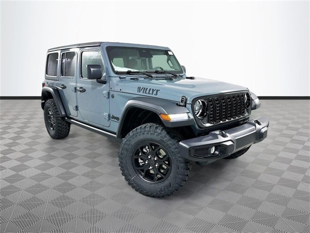 Anvil Clear Coat 2026 Jeep Wrangler Willys 4WD 2.0L I4 DOHC 4D Sport Utility 8-Speed Automatic 12.3" Touchscreen Display, 2-Door Passive Entry, Front Door Locks, 4-Wheel Disc Brakes, 4-Wheel Drive Swing Gate Decal, 4G LTE Wi-Fi Hot Spot, 7 and 4 Pin Wiring Harness, 8 Speakers, ABS brakes, Advanced Brake Assist, Air Conditioning, Air Conditioning with Auto Temp Control, Air Filtering, AM/FM radio: SiriusXM with 360L, Apple CarPlay, Apple CarPlay/Android Auto, Automatic Headlamps, Aux Battery, Auxiliary Switches, Black 3-Piece Hard Top, Black Grille, Brake assist, Class II Receiver Hitch, Cloth Low-Back Bucket Seats, Cluster 7.0" TFT Color Display, Compass, Connectivity - US/Canada, Convenience Group, Conventional Differential Front Axle, Corning Gorilla Glass, Dana M210 Wide HD Tube Front Axle, Dana M220 Wide Rear Axle, Daytime Running Lamps LED Accents, Deep Tint Sunscreen Windows, Delay-off headlights, Driver door bin, Driver vanity mirror, Dual front impact airbags, Dual front side impact airbags, E-Locker Rear Axle, Electronic Stability Control, Emergency/Assistance Call, Enhanced Adaptive Cruise Control, For More Info, Call 800-643-2112, Freedom Panel Storage Bag, Front anti-roll bar, Front Bucket Seats, Front Center Armrest w/Storage, Front fog lights, Front LED Fog Lamps, Front reading lights, Full Speed Forward Collision Warning Plus, Google Android Auto, Heated Front Seats, Heated Steering Wheel, Illuminated entry, Injection Molded Black Rear Bumper, Integrated Center Stack Radio, Integrated roll-over protection, LED Premium Reflector Headlamps, Low tire pressure warning, Mold in Color Bumper with Gloss Black, Molded in Color Rubicon Highline Flare, MOPAR All-Weather Floor Mats, Non-Lock Fuel Cap Without Discriminator, Normal Duty Suspension, Occupant sensing airbag, Off-Road Plus Mode, Outside temperature display, Overhead airbag, Panic alarm, ParkView Rear Back-Up Camera, Passenger door bin, Passenger vanity mirror, Power Heated Mirrors, Power steering, Power windows, Premium Wrapped Steering Wheel, Quick Order Package 22W Willys, Radio data system, Radio: Uconnect 5 with 12.3" Display, Rear anti-roll bar, Rear reading lights, Rear Window Defroster, Rear Window Wiper/Washer, Remote keyless entry, Security Alarm, SiriusXM Radio Service, SiriusXM with 360L, Speed control, Split folding rear seat, Steering wheel mounted audio controls, Stop-Start Dual Battery System, Sun Visors with Illuminated Vanity Mirrors, Tachometer, Telescoping steering wheel, Tilt steering wheel, Traction control, Trip computer, Universal Garage Door Opener, Variably intermittent wipers, Wheels: 17" x 7.5" Black Steel Styled, Wheels: 17" x 7.5" Painted Black, Willy's Suspension, Willys Hood Decal.