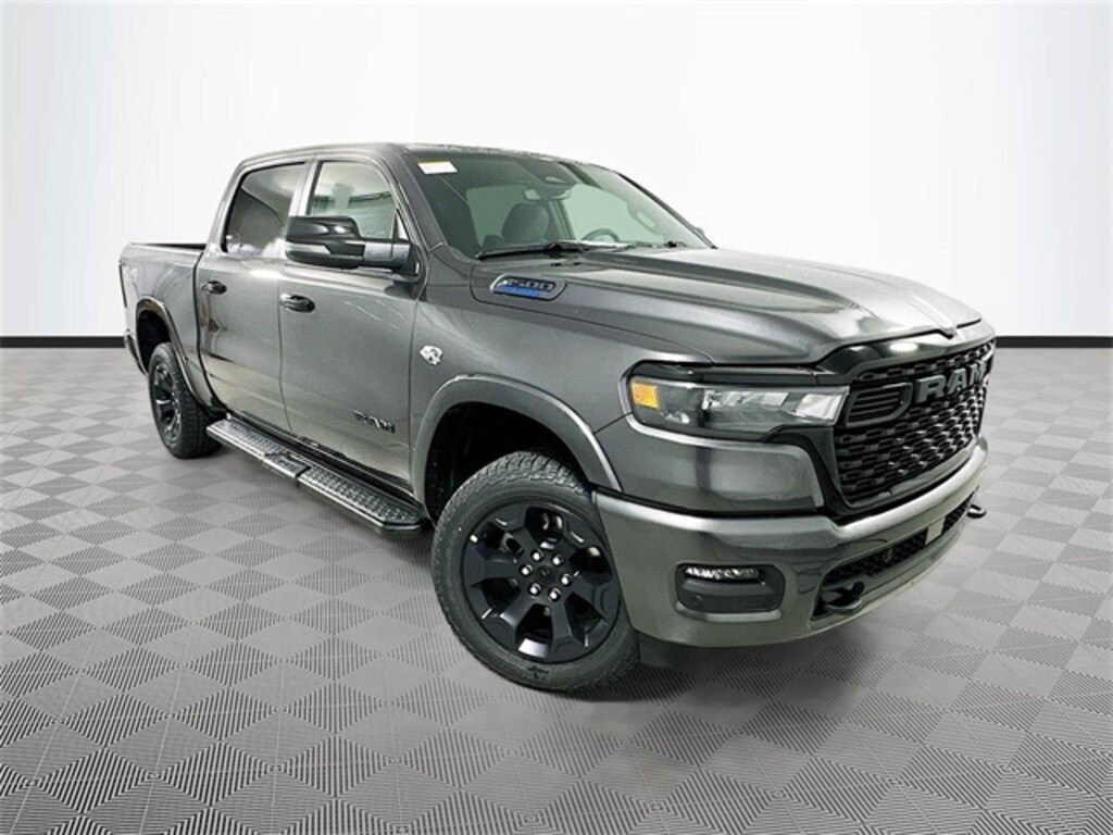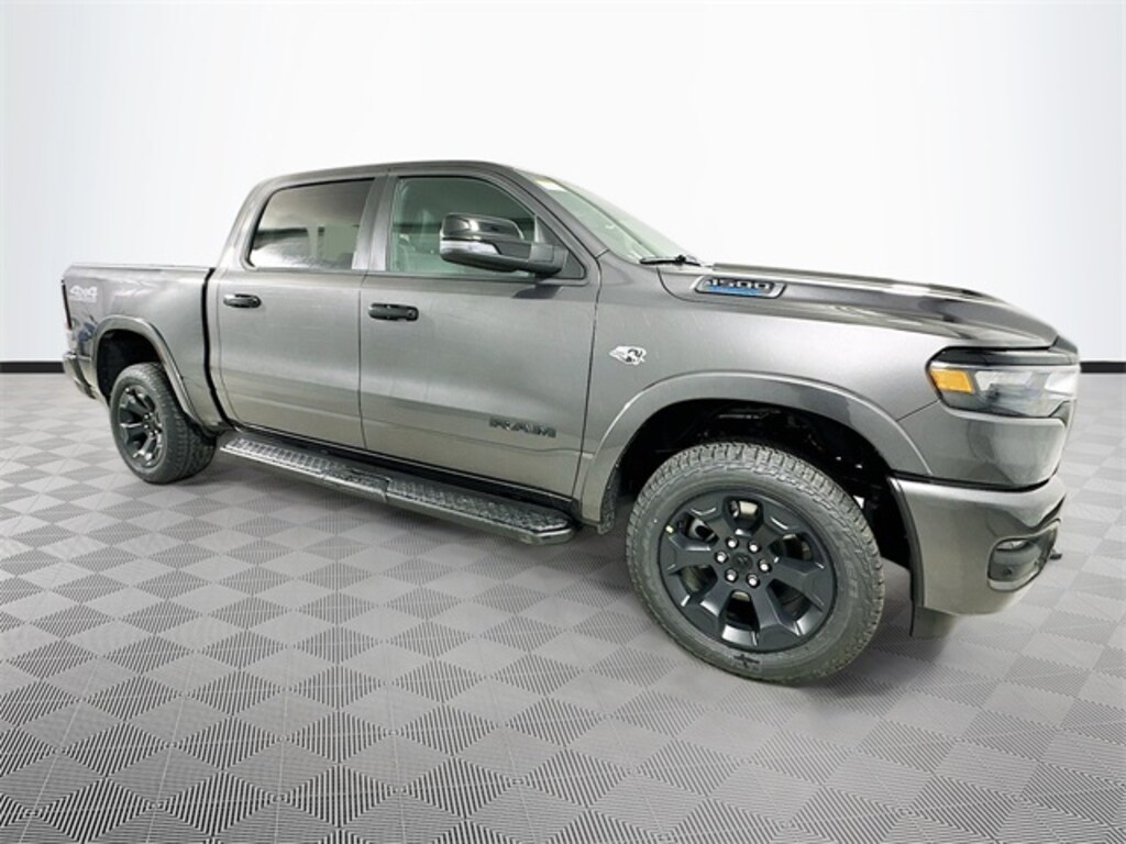Granite Crystal Metallic Clearcoat 2026 Ram 1500 Big Horn/Lone Star 4WD HEMI 5.7L V8 Multi Displacement VVT eTorque 4D Crew Cab Automatic 115V Auxiliary Power Outlet, 2nd Row in Floor Storage Bins, 3 Rear Seat Head Restraints, 4 Way Front Headrests, 4-Wheel Disc Brakes, 400W Inverter, 48V Belt Starter Generator, 4G LTE Wi-Fi Hot Spot, 6 Speakers, ABS brakes, Accent Color Door Handles, Accent Color Premium Power Mirrors, Accent Color Tailgate Handle, Air Conditioning, Alloy wheels, AM/FM radio, Anti-Spin Differential Rear Axle, Apple CarPlay, Apple CarPlay/Android Auto, Auto High-beam Headlights, Auto Power-Folding Mirrors, Auto-Dimming Exterior Driver Mirror, Auto-Dimming Rear-View Mirror, Big Horn Level 1 Equipment Group, Black Exterior Mirrors, Black Exterior Truck Badging, Black Headlamp Bezels, Black Interior Accents, Black Painted Exterior Mirrors Caps, Black Premium Power Mirrors, Black Tail Lamp Bezels, Body Color Fender Flares, Body Color Front Bumper, Body Color Rear Bumper with Step Pads, Brake assist, Bucket Seats, Bumpers: chrome, Center Console Parts Module, Cloth Bucket Seats, Compass, Connectivity - US/Canada, Convex Wide-Angle Exterior Mirror Insert, Delay-off headlights, Deluxe Cloth Bucket Seats, Driver door bin, Dual Exhaust with Black Tips, Dual front impact airbags, Dual front side impact airbags, E-Locker Rear Axle, Electronic Stability Control, Exterior Mirrors Courtesy Lamps, Exterior Mirrors with Heating Element, Exterior Mirrors with Supplemental Signals, Front anti-roll bar, Front Bucket Seats, Front Center Armrest w/Storage, Front Extra Heavy Duty Shock Absorbers, Front fog lights, Front License Plate Bracket, Front reading lights, Front Seat Back Map Pockets, Front wheel independent suspension, Full Length Floor Console, Fully automatic headlights, Global Telematics Box Module, Glove Box Lamp, Google Android Auto, GPS Antenna Input, Grille Black Surround Black Mesh, Heated door mirrors, Heated Front Seats, Heated Steering Wheel, Illuminated entry, Integrated Center Stack Radio, Integrated Voice Command with Bluetooth, Leather Wrapped Steering Wheel, Low tire pressure warning, Manual Adjust 4-Way Driver Seat, Manual Adjust 4-Way Front Passenger Seat, Manual Folding Exterior Mirrors, Manufacturer's Statement of Origin, Mopar Black Tubular Side Steps, Night Edition, Occupant sensing airbag, Off Road Decals, Off Road Group, Outside temperature display, Overhead airbag, Overhead console, Panic alarm, ParkView Rear Back-Up Camera, Passenger door bin, Passenger vanity mirror, Power 2-Way Driver Lumbar Adjust, Power Adjust 8-Way Driver Seat, Power Adjustable Pedals, Power door mirrors, Power steering, Power windows, Quick Order Package 23Z Big Horn, Quick Order Package 27Z Big Horn, Radio data system, Radio: Uconnect 5 W with 8.4" Display, Raised Ride Height, RAM Grille Badge - Black, RAM Grille Badge - Chrome, Rear 60/40 Folding Seat, Rear anti-roll bar, Rear Center Armrest, Rear Dome with on/Off Switch Lamp, Rear Extra Heavy Duty Shock Absorbers, Rear Power Sliding Window, Rear step bumper, Rear Window Defroster, Remote keyless entry, Selec-Speed Control, SiriusXM Radio Service, SiriusXM Satellite Radio, Speed control, Steering Wheel Mounted Audio Controls, Sun Visors with Illuminated Vanity Mirrors, Supplier Part Tracking (J-1), Tachometer, Telescoping steering wheel, Tilt steering wheel, Tow Hooks, Traction control, Trailer Brake Control, Trip computer, Universal Garage Door Opener, USB Host Flip, Variably intermittent wipers, Voltmeter, Wheels: 20" x 9.0" Aluminum Painted Clad.