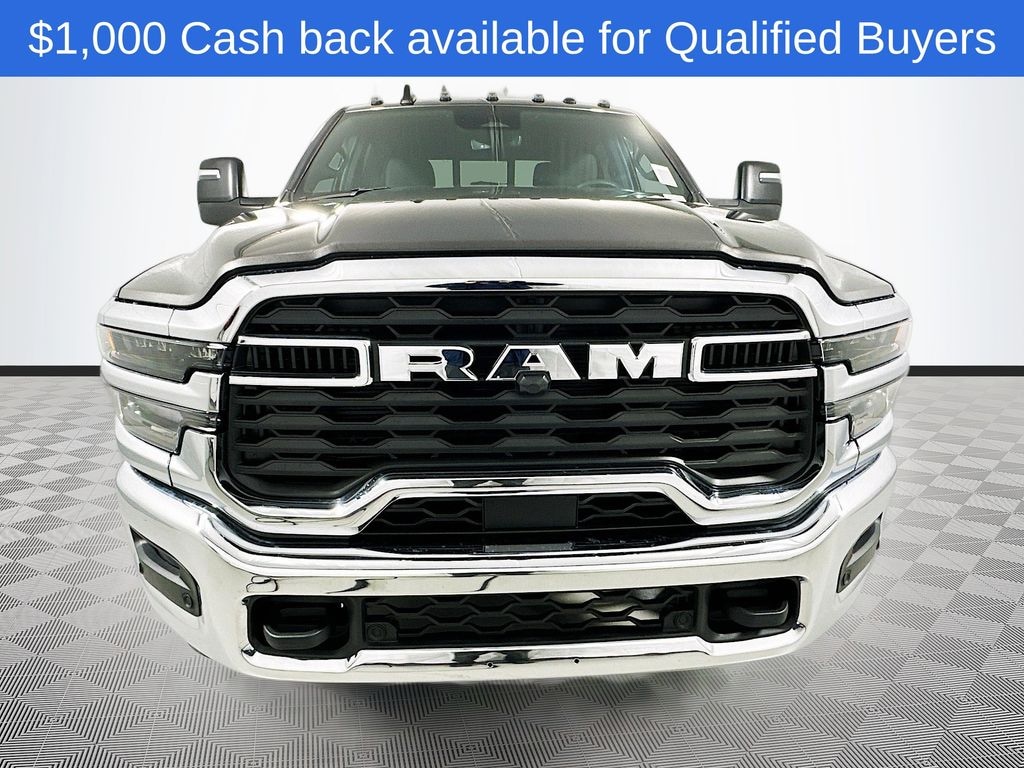 Crystal Metallic 2026 Ram 2500 Tradesman 4WD 6.4L V8 4D Crew Cab 8-Speed Automatic 115-Volt Auxiliary Front Power Outlet, 12" Touchscreen Display, 2 Way Rear Headrest Seat, 3.73 Axle Ratio, 4 Way Front Headrests, 4-Wheel Disc Brakes, 40/20/40 Split Bench Seat, 400W Inverter, 4G LTE Wi-Fi Hot Spot, 6 Speakers, ABS brakes, Air Conditioning, Air Conditioning ATC with Dual Zone Control, Alexa Built-in, AM/FM radio: SiriusXM, Anti-Spin Differential Rear Axle, Apple CarPlay, Apple CarPlay/Android Auto, Auto-Dimming Rear-View Mirror, Bed Convenience Group, Black Exterior Mirrors, Black Wheel Center Hub, Brake assist, Bright Front Bumper, Bright Rear Bumper, Carpet Floor Covering, Center Hub, Chrome Grille Surround, Clearance Lamps, Cloth 40/20/40 Bench Seat, Commercial Features Package, Compass, Connected Travel and Traffic Services, Connectivity - US/Canada, Dash Pass Thru Wire Circuits, Delay-off headlights, Disassociated Touchscreen Display, Driver door bin, Dual front impact airbags, Dual front side impact airbags, Electronic Stability Control, Emergency Vehicle Alert System (EVAS), Exterior 115V AC Outlet, Exterior Mirrors Courtesy Lamps, Exterior Mirrors with Heating Element, Exterior Mirrors with Supplemental Signals, For Details, Visit DriveUconnect.com, For More Info, Call 800-643-2112, Front and Rear Floor Mats, Front anti-roll bar, Front Armrest with Cupholders, Front Center Armrest w/Storage, Front fog lights, Front License Plate Bracket, Front reading lights, Fully automatic headlights, Global Telematics Box Module, Google Android Auto, GPS Antenna Input, GPS Navigation, HD Radio, Illuminated entry, Instrument Panel Mounted Auxiliary Switches, Integrated Voice Command with Bluetooth, LED Bed Lighting, Low tire pressure warning, Manual Adjust 4-Way Driver Seat, Manual Adjust 4-Way Front Passenger Seat, Manual Folding Exterior Mirrors, Manual Telescoping Mirrors, Manufacturer's Statement of Origin, Matte Black Mesh Grille with Chrome, Mirror Running Lights, Mopar Black Tubular Side Steps, MOPAR Spray in Bedliner, Occupant sensing airbag, Off-Road Info Pages, Outside temperature display, Overhead airbag, Overhead console, Panic alarm, ParkSense Front/Rear Park Assist System, ParkView Rear Back-Up Camera, Passenger door bin, Passenger vanity mirror, Power Adjust Mirrors, Power Heated Folding Telescope Mirrors, Power steering, Power windows, Power-Adjustable Convex Aux Mirrors, Quick Order Package 2UA Tradesman, Radio data system, Radio: Uconnect 5 Navigation with 12.0" Display, Radio: Uconnect 5 with 8.4" Display, Rear anti-roll bar, Rear Folding Seat, Rear Power Sliding Window, Rear step bumper, Rear window defroster, Remote keyless entry, Remote USB Port - Charge Only, Selectable Tire Fill Alert, SiriusXM Radio Service, SiriusXM with 360L, Speed control, Storage Tray, Tachometer, Tilt steering wheel, Tinted Acoustic Windshield Glass, Traction control, Tradesman Level 2 Equipment Group, Trailer Tow Pages, Variably intermittent wipers, Voltmeter, Wheels: 17" x 7.5" Black Steel Styled, Wheels: 18" x 8.0" Steel Chrome Clad.