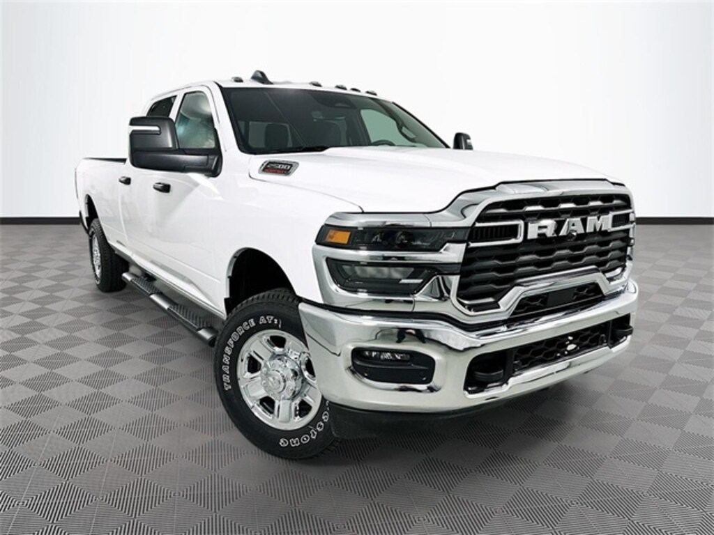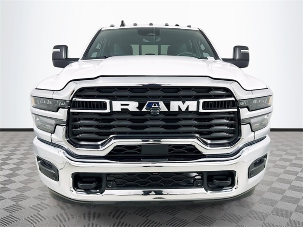 White 2026 Ram 2500 Tradesman 4WD 6.4L V8 4D Crew Cab 8-Speed Automatic 115V Auxiliary Front Power Outlet, 12" Touchscreen Display, 2 Way Rear Headrest Seat, 3.73 Axle Ratio, 4 Way Front Headrests, 4-Wheel Disc Brakes, 40/20/40 Split Bench Seat, 400W Inverter, 4G LTE Wi-Fi Hot Spot, 5th Wheel/Gooseneck Towing Prep Group, 6 Speakers, ABS brakes, Air Conditioning, Air Conditioning ATC w/Dual Zone Control, Alexa Built-In, AM/FM radio: SiriusXM, Anti-Spin Differential Rear Axle, Apple CarPlay, Apple CarPlay/Android Auto, Auto-Dimming Rear-View Mirror, Bed Convenience Group, Black Exterior Mirrors, Black Wheel Center Hub, Brake assist, Bright Front Bumper, Bright Rear Bumper, Carpet Floor Covering, Center Hub, Chrome Grille Surround, Clearance Lamps, Cloth 40/20/40 Bench Seat, Commercial Features Package, Compass, Connected Travel & Traffic Services, Connectivity - US/Canada, Dash Pass Thru Wire Circuits, Delay-off headlights, Disassociated Touchscreen Display, Driver door bin, Dual front impact airbags, Dual front side impact airbags, Electronic Stability Control, Emergency Vehicle Alert System (EVAS), Exterior 115V AC Outlet, Exterior Mirrors Courtesy Lamps, Exterior Mirrors w/Heating Element, Exterior Mirrors w/Supplemental Signals, For Details, Visit DriveUconnect.com, For More Info, Call 800-643-2112, Front & Rear Floor Mats, Front anti-roll bar, Front Armrest w/Cupholders, Front Center Armrest w/Storage, Front fog lights, Front License Plate Bracket, Front reading lights, Fully automatic headlights, Global Telematics Box Module (TBM), Google Android Auto, GPS Antenna Input, GPS Navigation, HD Radio, Heavy Duty Vinyl 40/20/40 Split Bench Seat, I/P Mounted Auxiliary Switches, Illuminated entry, Integrated Voice Command w/Bluetooth, LED Bed Lighting, Low tire pressure warning, Manual Adjust 4-Way Driver Seat, Manual Adjust 4-Way Front Passenger Seat, Manual Folding Exterior Mirrors, Manual Telescoping Mirrors, Manufacturer's Statement of Origin, Matte Black Mesh Grille w/Chrome, Mirror Running Lights, Mopar Black Tubular Side Steps, MOPAR Front & Rear Rubber Floor Mats, MOPAR Spray In Bedliner, Occupant sensing airbag, Off-Road Info Pages, Outside temperature display, Overhead airbag, Overhead console, Panic alarm, ParkSense Front/Rear Park Assist System, ParkView Rear Back-Up Camera, Passenger door bin, Passenger vanity mirror, Power Adjust Mirrors, Power Heated Folding Telescope Mirrors, Power steering, Power windows, Power-Adjustable Convex Aux Mirrors, Quick Order Package 2UA Tradesman, Radio data system, Radio: Uconnect 5 Nav w/12.0" Display, Radio: Uconnect 5 w/8.4" Display, Rear anti-roll bar, Rear Folding Seat, Rear Power Sliding Window, Rear step bumper, Rear window defroster, Remote keyless entry, Remote USB Port - Charge Only, Selectable Tire Fill Alert, SiriusXM Radio Service, SiriusXM w/360L, Speed control, Storage Tray, Tachometer, Tilt steering wheel, Tinted Acoustic Windshield Glass, Traction control, Tradesman Level 2 Equipment Group, Trailer Tow Pages, Variably intermittent wipers, Voltmeter, Wheels: 17" x 7.5" Black Steel Styled, Wheels: 18" x 8.0" Steel Chrome Clad.