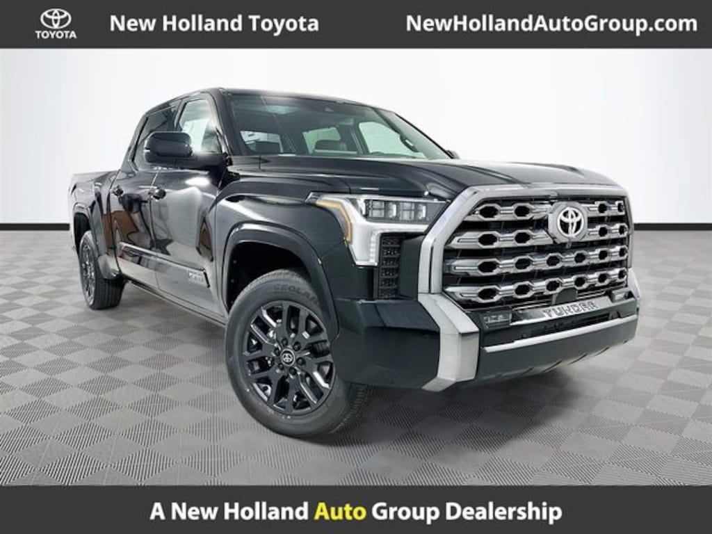 Midnight Black Metallic 2025 Toyota Tundra Platinum 4WD 3.4L V6 4D CrewMax 10-Speed Automatic 4WD, Black w/Premium Leather Seat Trim, Apple CarPlay/Android Auto, Heated front seats, Heated rear seats, Navigation System, Power moonroof, 10-Way Pwr Adj Heated and Ventilated Front Seats, 12 Speakers, 3.31 Axle Ratio, 4-Wheel Disc Brakes, ABS brakes, Air Conditioning, All Weather Floor Liners (TMS), Alloy wheels, AM/FM radio: SiriusXM, Auto High-beam Headlights, Auto-dimming door mirrors, Auto-dimming Rear-View mirror, Automatic temperature control, Black Front Bumper Letters (TMS), Brake assist, Bumpers: body-color, Delay-off headlights, Driver door bin, Driver vanity mirror, Dual front impact airbags, Dual front side impact airbags, Electronic Stability Control, Emergency communication system: Safety Connect (10-year trial), Exterior Parking Camera Rear, Front anti-roll bar, Front Bucket Seats, Front Center Armrest, Front dual zone A/C, Front fog lights, Front reading lights, Front wheel independent suspension, Fully automatic headlights, Garage door transmitter: HomeLink, Head Up Display (HUD), Heated door mirrors, Heated steering wheel, Illuminated entry, Knee airbag, Leather Shift Knob, Leather steering wheel, Low tire pressure warning, Memory seat, Occupant sensing airbag, Outside temperature display, Overhead airbag, Overhead console, Panic alarm, Passenger door bin, Passenger vanity mirror, Power door mirrors, Power driver seat, Power passenger seat, Power Running Boards, Power steering, Power windows, Premium Leather Seat Trim, Radio data system, Radio: Audio Multimedia System, Rain sensing wipers, Rear reading lights, Rear seat center armrest, Rear step bumper, Rear window defroster, Remote keyless entry, Safety Connect, Security system, Speed control, Speed-sensing steering, Split folding rear seat, Steering wheel memory, Steering wheel mounted audio controls, Tachometer, Telescoping steering wheel, Tilt steering wheel, Traction control, Tri-Fold Tonneau Cover (TMS), Trip computer, Turn signal indicator mirrors, Variably intermittent wipers, Ventilated front seats, Ventilated rear seats, Voltmeter, Wheels: 20 Dark Painted Alloy, 4WD, Black w/Premium Leather Seat Trim, Apple CarPlay/Android Auto, Heated front seats, Heated rear seats, Navigation System, Power moonroof.