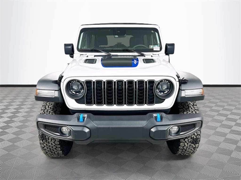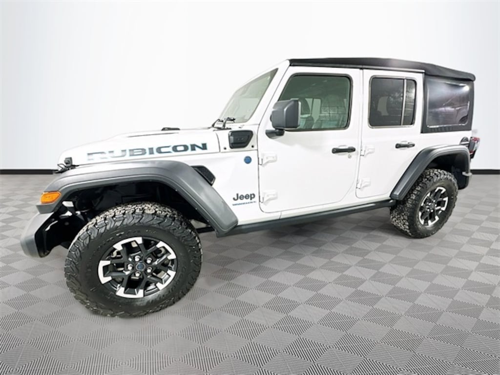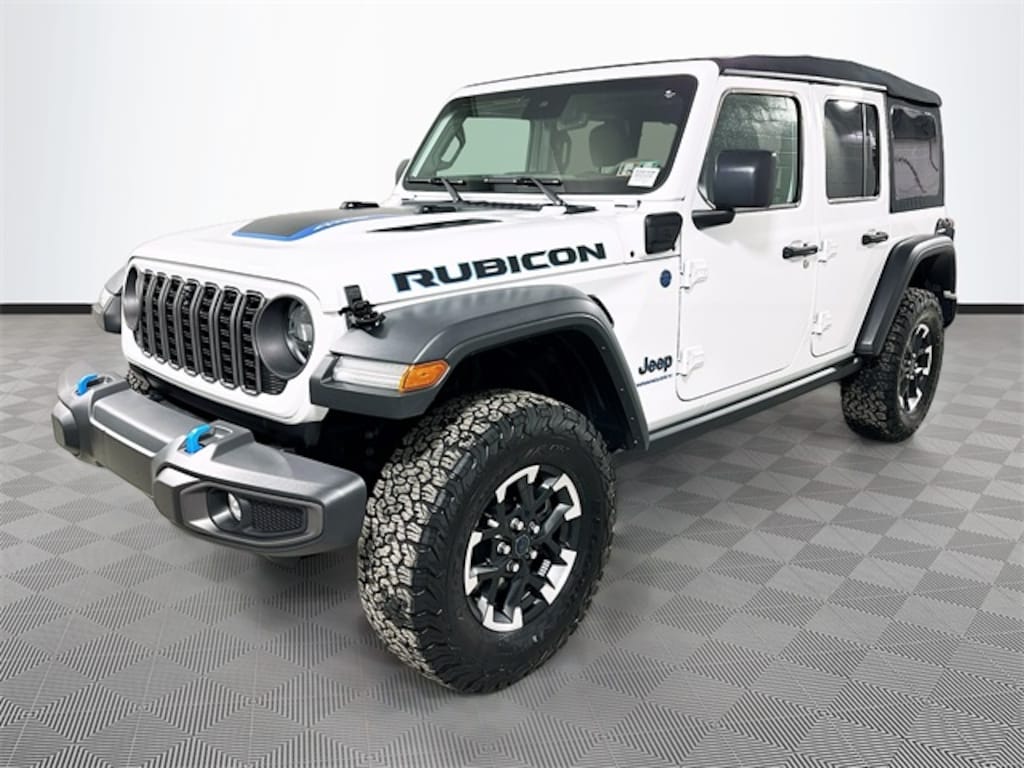 Wrangler Rubicon 4xe, 4D Sport Utility, 2.0L I4 DOHC, 4WD, Bright White Clearcoat, Black Leather, 12.3" Touchscreen Display, 4G LTE Wi-Fi Hot Spot, Alpine Premium Audio System, Apple CarPlay, Auto High Beam Headlamp Control, Auto-Dimming Rear-View Mirror, Blind Spot & Cross Path Detection, Connected Travel & Traffic Services, Connectivity - US/Canada, Convenience Group, Delay-off headlights, Disassociated Touchscreen Display, Front fog lights, Fully automatic headlights, Google Android Auto, GPS Navigation, HD Radio, Heated Front Seats, Heated Steering Wheel, Integrated Center Stack Radio, Integrated Off-Road Camera, Integrated Voice Command w/Bluetooth, Panic alarm, ParkSense Rear Park Assist System, Quick Order Package 29V Rubicon, Radio: Uconnect 5 Nav w/12.3" Display, Remote Start System, Safety Group, Security system, SiriusXM Radio Service, SiriusXM w/360L, Speed control, Technology Group, Universal Garage Door Opener, 4-Wheel Disc Brakes, 4.10 Rear Axle Ratio, 8 Speakers, ABS brakes, Air Conditioning, Alloy wheels, AM/FM radio: SiriusXM, Apple CarPlay/Android Auto, Automatic temperature control, Brake assist, Compass, Driver door bin, Driver vanity mirror, Dual front impact airbags, Dual front side impact airbags, Electronic Stability Control, Emergency communication system: Jeep Connect, Front anti-roll bar, Front Bucket Seats, Front Center Armrest w/Storage, Front dual zone A/C, Front License Plate Bracket, Front reading lights, Heated door mirrors, Illuminated entry, Integrated roll-over protection, Low tire pressure warning, MOPAR All-Weather Floor Mats, Occupant sensing airbag, Outside temperature display, Overhead airbag, ParkView Rear Back-Up Camera, Passenger door bin, Passenger vanity mirror, Performance Suspension, Power door mirrors, Power steering, Power windows, Radio data system, Radio: Uconnect 5 w/12.3" Display, Rear anti-roll bar, Rear reading lights, Remote keyless entry, Soft Top Window Storage Bag, Split folding rear seat, Steering wheel mounted audio controls, Sustainable Premium Cloth Seats, Tachometer, Telescoping steering wheel, Tilt steering wheel, Traction control, Trip computer, Variably intermittent wipers, Voltmeter, Wheels: 17" x 7.5" Machined w/Black Pockets, Wrangler Rubicon 4xe, 4D Sport Utility, 2.0L I4 DOHC, 4WD, Bright White Clearcoat, Black Leather, 12.3" Touchscreen Display, 4G LTE Wi-Fi Hot Spot, Alpine Premium Audio System, Apple CarPlay, Auto High Beam Headlamp Control, Auto-Dimming Rear-View Mirror, Blind Spot & Cross Path Detection, Connected Travel & Traffic Services, Connectivity - US/Canada, Convenience Group, Delay-off headlights, Disassociated Touchscreen Display, Front fog lights, Fully automatic headlights, Google Android Auto, GPS Navigation, HD Radio, Heated Front Seats, Heated Steering Wheel, Integrated Center Stack Radio, Integrated Off-Road Camera, Integrated Voice Command w/Bluetooth, Panic alarm, ParkSense Rear Park Assist System, Quick Order Package 29V Rubicon, Radio: Uconnect 5 Nav w/12.3" Display, Remote Start System, Safety Group, Securit